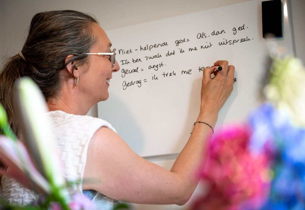 Het idee van Cognitieve gedragstherapie is dat je je bewust wordt van je gedachten, gevoelens en gedrag. Deze hebben namelijk invloed op elkaar. We geven een voorbeeld: als jij ervan overtuigd bent dat je waardeloos bent, of bijvoorbeeld geen goede ouder bent, dan zul je merken dat je je somber voelt. Je merkt dit ook aan je gedrag: je gaat je meer terugtrekken. Vaak houdt dit gedrag je negatieve gedachte in stand. Bij Cognitieve gedragstherapie leer je stil te staan bij je negatieve niet-helpende gedachten. Ook buig je niet-helpende gedachten om naar gedachten die je wél helpen. Je zult zien dat je je hierdoor beter gaat voelen. En je gaat je anders gedragen. Je zult situaties weer aangaan en je zult je minder terugtrekken. Je doet zo positieve leerervaringen op. Soms zal de behandeling zich meer richten op je gedachten en soms juist op het gedrag. Soms een combinatie van deze twee.